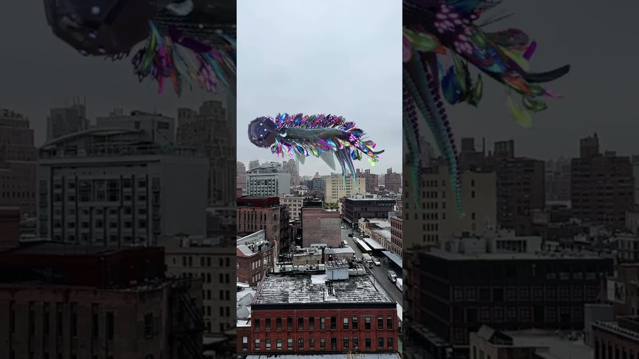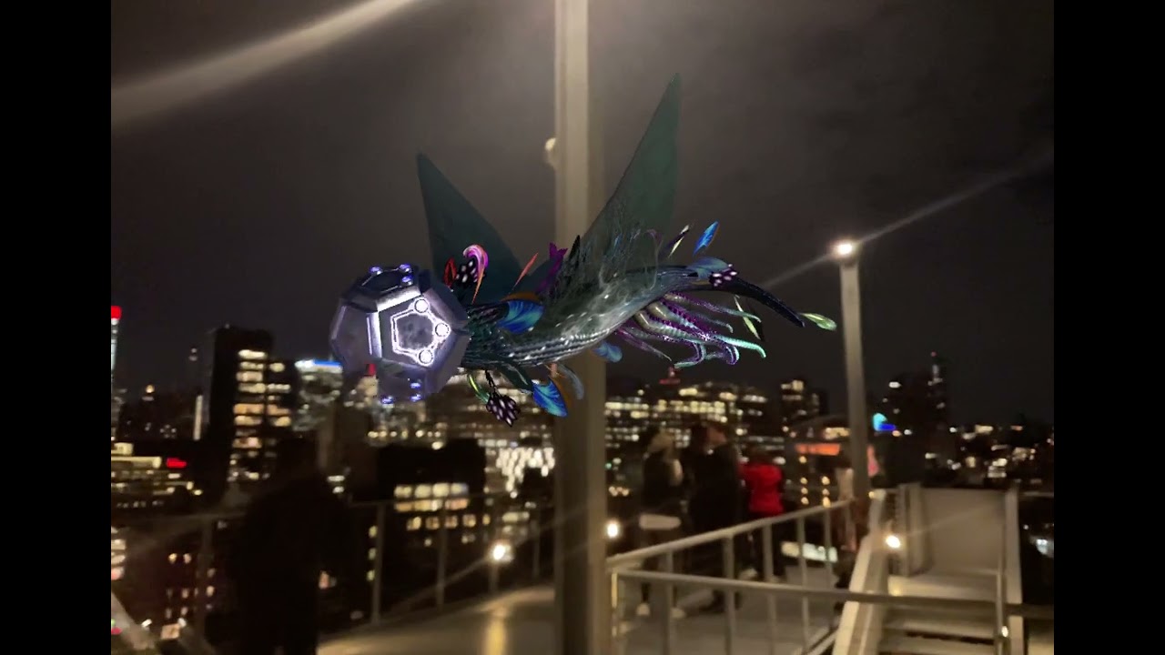 You can view and interact with CENTO in person on the Whitney Museum’s terraces, with Floor 8 as the prime viewing point and Floors 5 and 6 providing different angles. Use the QR code on the terrace signage to download the free 4th Wall AR app to select a feather to add to the creature.
