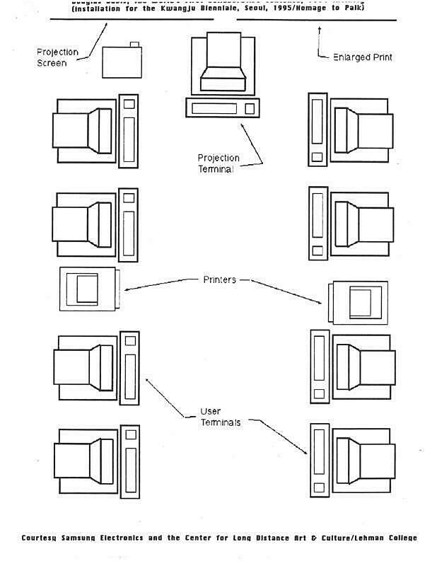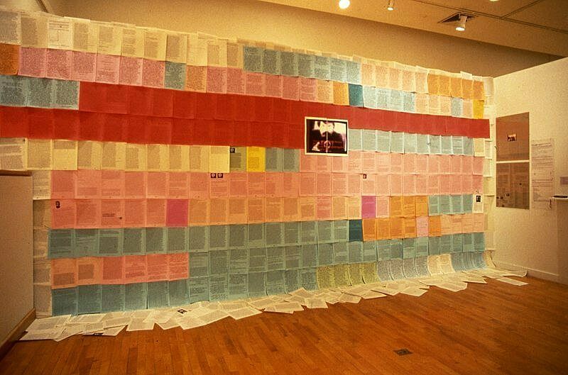 Between 1994 and 2000, The World’s First Collaborative Sentence was exhibited in gallery spaces including Lehman College Art Gallery, Bronx New York; the 1995 Gwangju Biennale, South Korea; and the Whitney Museum of American Art, New York. The below floor plan, installation view, and "official image" of the Sentence provide insight into the work’s distinct materiality.