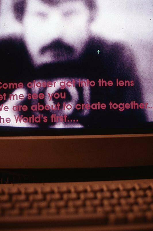 It began in December 1994, when the Lehman College Art Gallery and its director, Susan Hoeltzel, commissioned The World’s First Collaborative Sentence as part of “InterActions,” a survey of Douglas Davis’ early work (1967-81) in a variety of media, from drawing, printmaking, and photography to performance, videotapes, and live satellite television broadcasting. Using a server provided by the City University of New York (CUNY)—and working closely with professor Robert Schneider in the department of mathematics at Lehman College—Davis documented the exhibition on the Web and created an entirely new work linked to the exhibition’s theme.