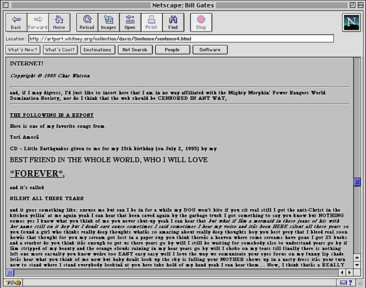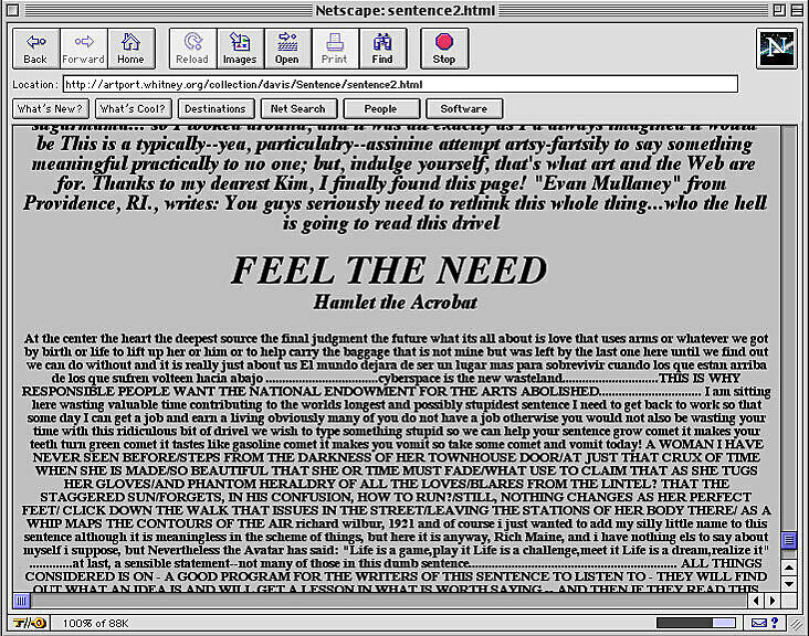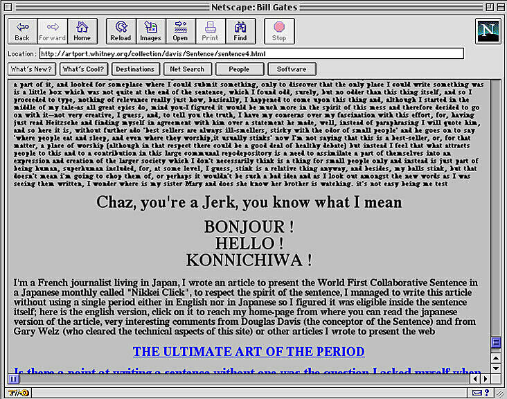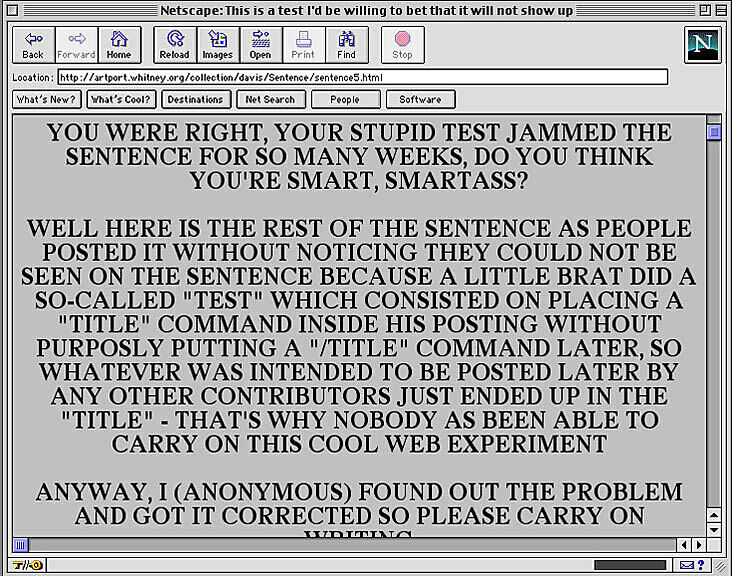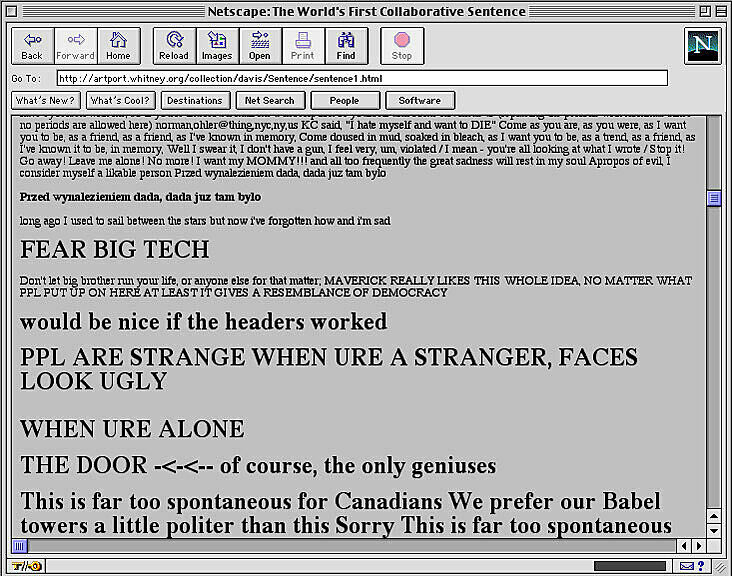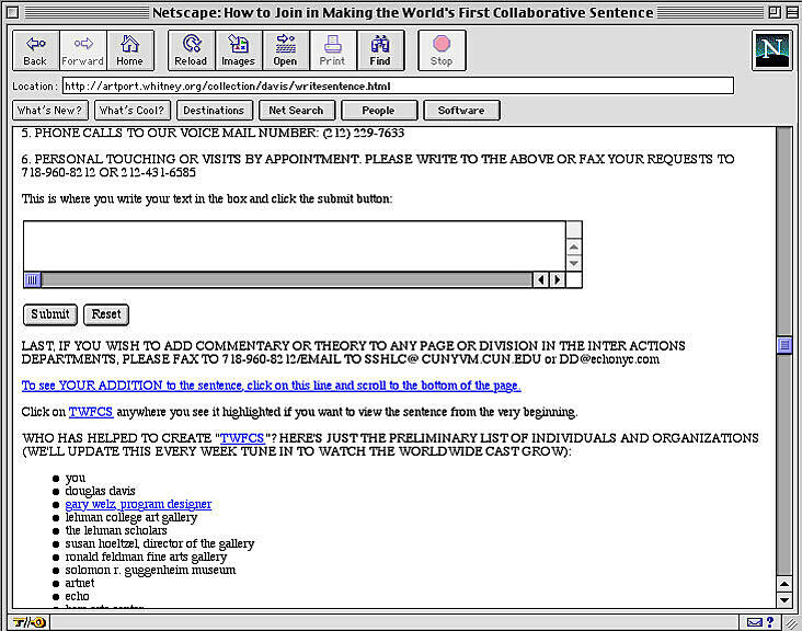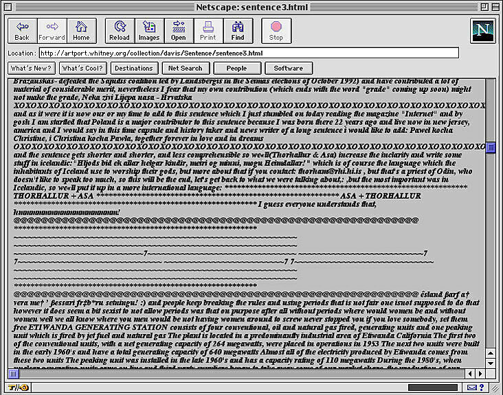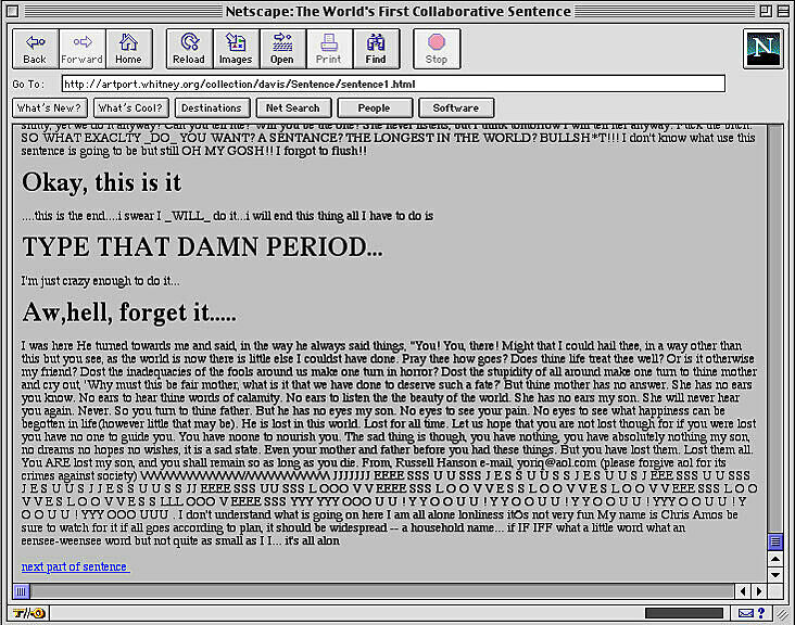 The World’s First Collaborative Sentence, created by Douglas Davis for a survey exhibition of his work in 1994 and donated to the Whitney in 1995, is a “classic” of Internet art. Allowing users to contribute to a never-ending sentence, it anticipated today’s blog environments and ongoing posts. In early 2012 the Whitney Museum undertook a preservation effort spearheaded by Carol Mancusi-Ungaro, Associate Director of Conservation and Research and Christiane Paul, Adjunct Curator of New Media, in concert with Farris Wahbeh, Manager, Cataloguing and Documentation, and implemented by Cass Fino-Radin, digital conservator at Rhizome, and the Museum's Digital Media department. The result of the initiative are the two versions of the Sentence accessible here.