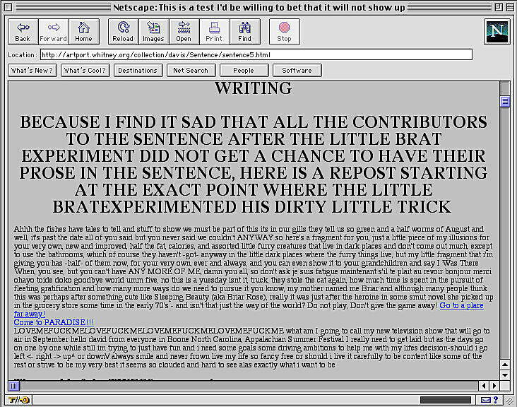 Unveiled on December 7, 1994, the site was linked to a live performance in the Lehman College Art Gallery. Artist Nathalie Novarina, participating in the performance via phone from Geneva, supplied the Sentence's maiden image and its first words. In collaboration with Gary Welz, Davis designed the formal interactive structure of the Sentence.