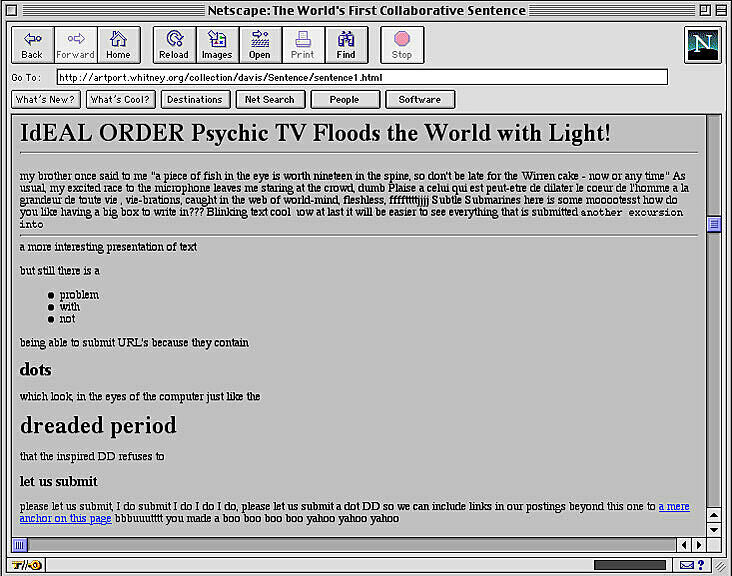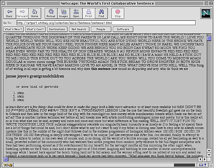 The World's First Collaborative Sentence is a “classic” of Internet art. With its collaborative, polyvocal, multilingual, and boundless nature, the Sentence became a microcosm of the Web itself. As a decidedly low-tech "multi-user environment" that allows for combinations of textual, visual, and aural components, it is a collective space which, in its broad array of voices and topics, achieves fluent transitions between the prosaic and the sublime.