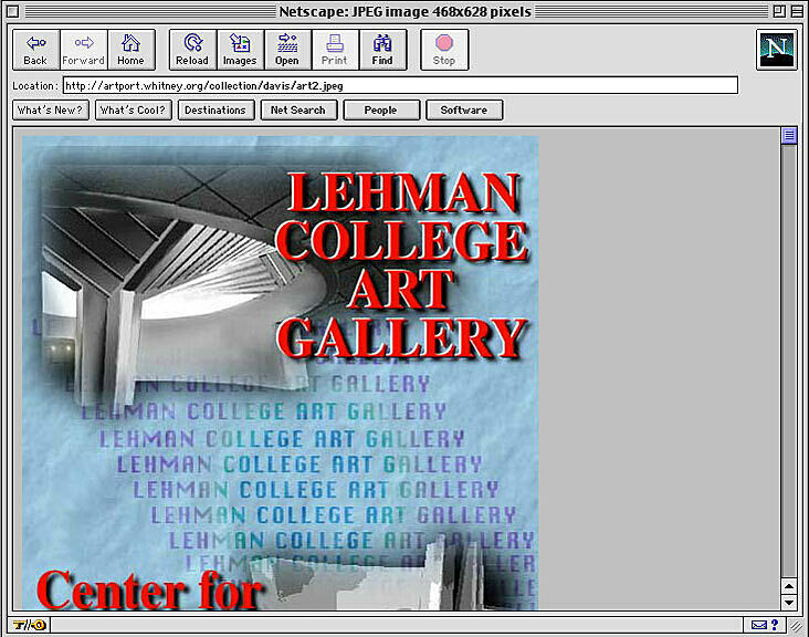 Douglas Davis’s The World’s First Collaborative Sentence (1994) is an ongoing textual and graphic online “performance” that was commissioned by the Lehman College Art Gallery, Bronx, N.Y. and The City University of New York, with the assistance of Gary Welz, Robert Schneider, and Susan Hoeltzel. Although the Whitney Museum of American Art acquired the Sentence in 1995 after it was shown in conjuction with Lehman College’s “InterActions,” a 1994 survey exhibition of the artist’s work, the piece was maintained on the website of Lehman College from 1994 until 2005. The work was generously donated to the Whitney by Barbara Schwartz, in honor of Eugene M. Schwartz, her late husband. Together they had purchased the concept and a signed disk with recordings of the first days of the Sentence from the artist.